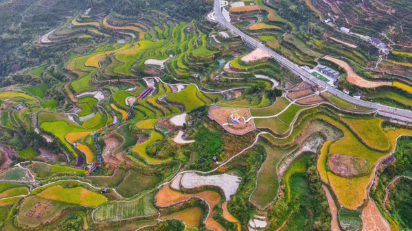 在小 舟山 村东侧,接连成片的千亩梯田,景色也十分壮观。五彩斑斓的镶嵌在大地上,沟沟壑壑,蜿蜒的曲线,描绘出了乡村最美的风景,自驾在这宛如仙境一般。