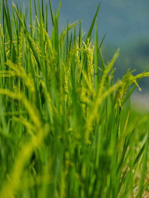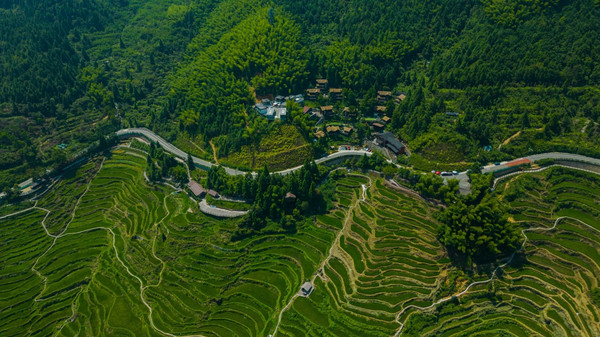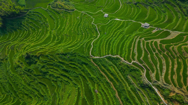 从民宿出来往上走几步就可以进入梯田景区。绿浪从山脚一直延伸到山顶,层层叠叠,形态各异。放眼望去,梯田高低错落间,优美的曲线一览无遗。