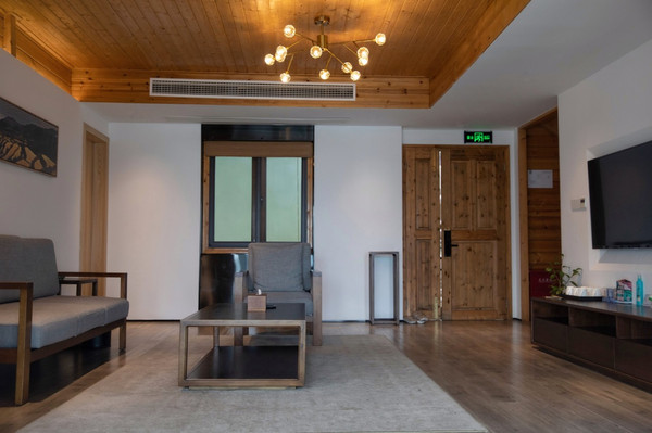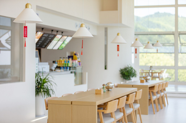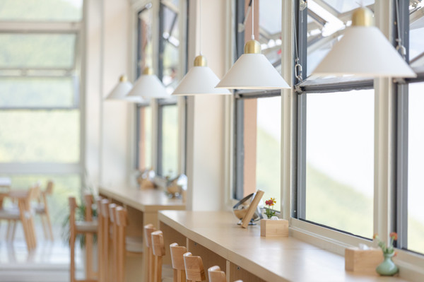 原木加白色的主色调,是我喜欢的风格。这里的一面座椅正对着外面的梯田,窗户都是敞开的,可以近距离的亲近大自然,感受大自然。