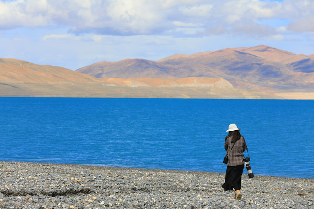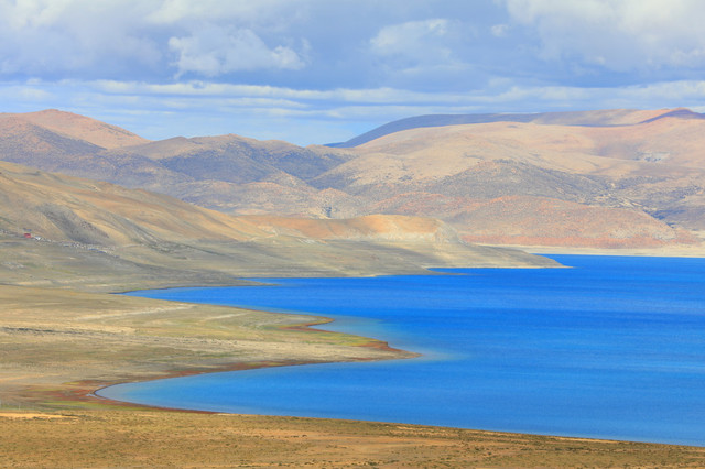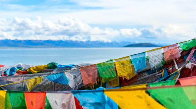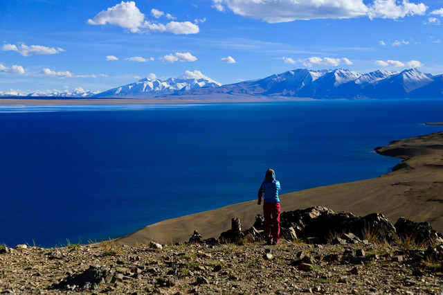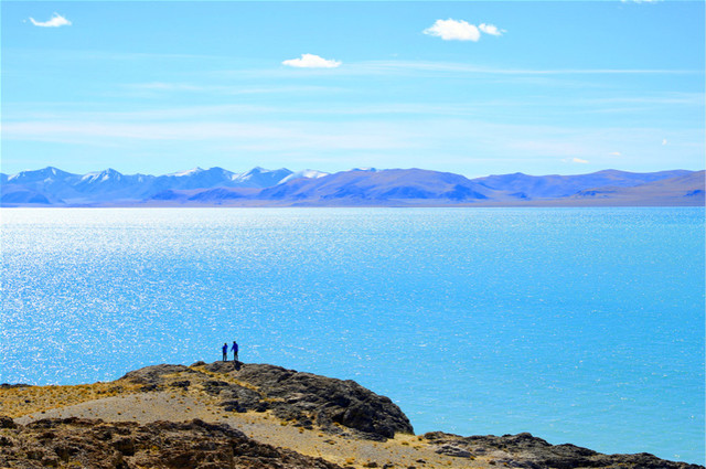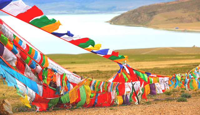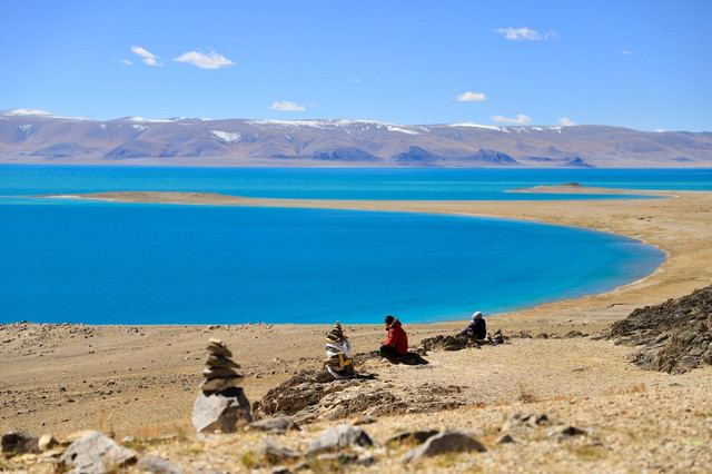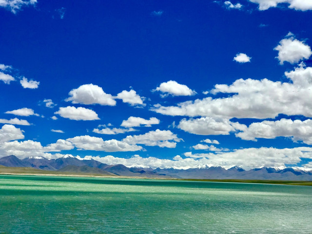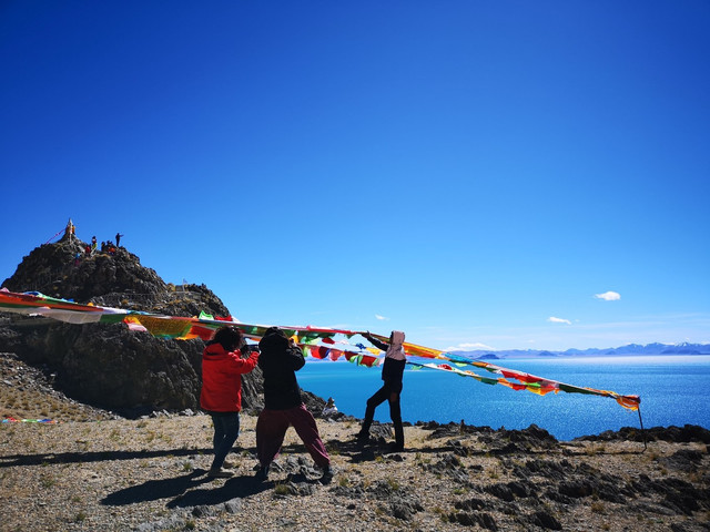 午饭后,驱车行驶来到【当惹雍错】的北岸。狭长的当惹雍错仿佛少女腰上碧蓝的腰带,从一头牵到另一头,湖中长条的小岛就像腰带上的刺绣,点缀得恰到好处,湖岸线勾勒出温柔起伏的曲线,湖边安静的羊群增添了几许生机,翻动的经幡、岸边一列雪山,仿佛是少女的守护神。