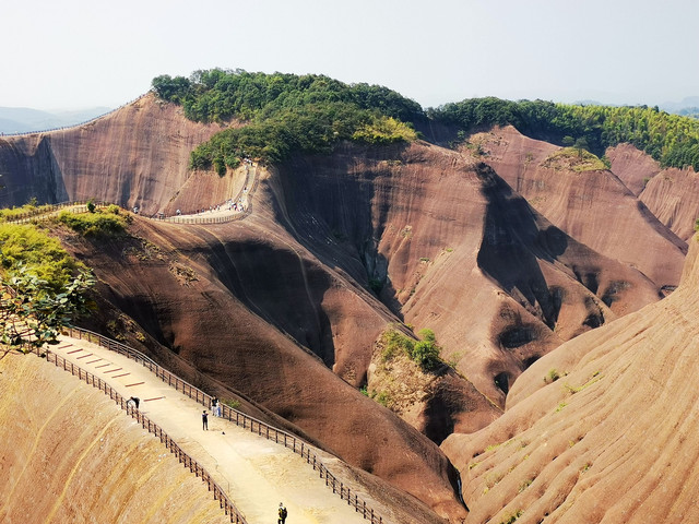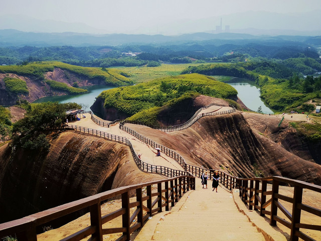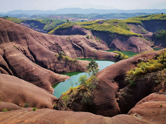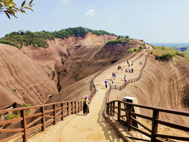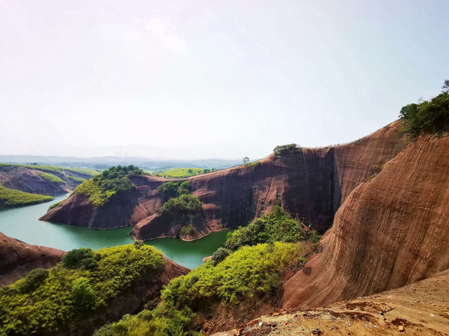 大约一小时的车程去到高椅岭主景区的最高处的停车场,停好车还要步行一段路才进入主景区。高椅岭风景区位于湖南省郴州市苏仙区桥口镇与资兴市交界处,是一块尚未开发的丹霞地貌处女地,其最大的特点就是丹霞地貌周边有漂亮的水洼点缀,红岩绿水、险寨奇涧,生态自然,美得一塌糊涂。高椅岭属原生态丹霞景区,是一个赏之叫绝、百走不厌的户外休闲摄影胜地。景区虽然进行了一些基本建设,但是由于没有收门票,所以没有管理,好几个口可以进到景区,景区到处垃圾。