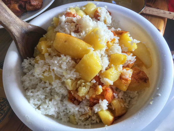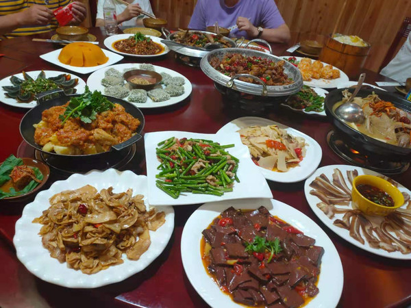 小杨带领我们回到了晚上住宿的地方,在住宿的地方搭配有食堂,可以选择基本的套餐,也可以选择单独点餐。晚上我们说想要吃得清淡一些,也不用太多的菜品,小杨就给我们安排非常好的晚餐招待,炖的腊肉,四个独具特色的扣碗:盐菜扣肉,糯米瘦肉丸子,渣海椒排骨,宝塔肉。当然,主食依然是让我恋恋不忘的洋芋饭。