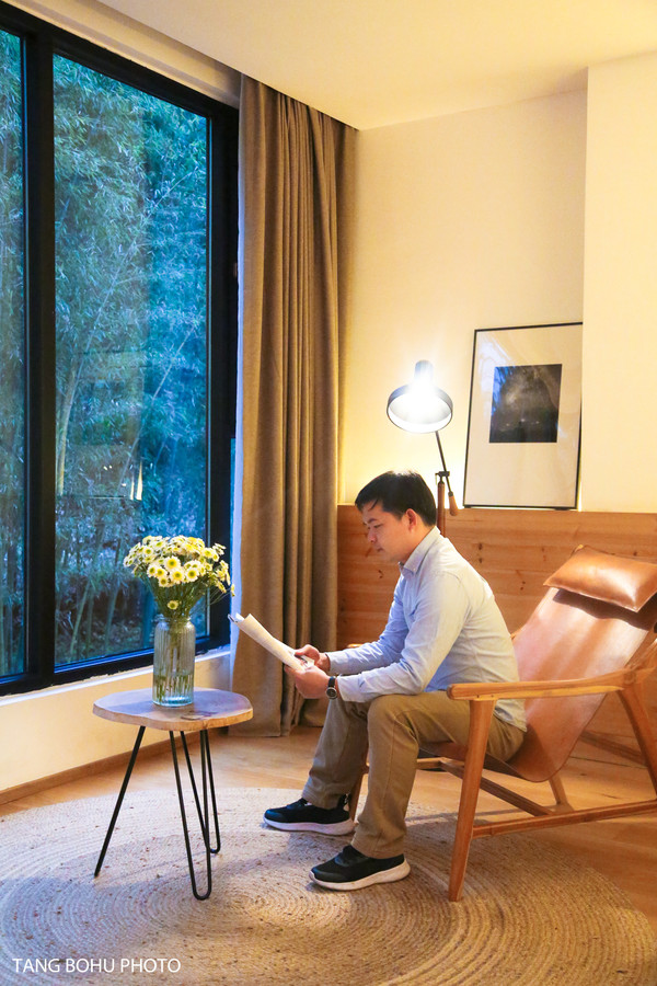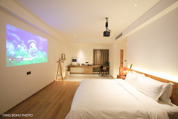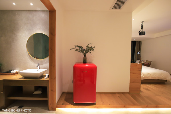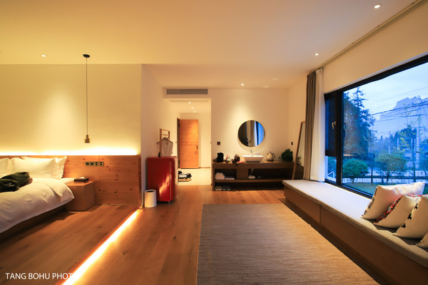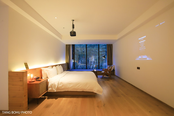 一共有10间房,每一个房间都拥有它的专属名,这次入住的是“竹中”。每个房间都是大大的落地窗,窗外是一整片竹林,冬天的时候这里还会下雪那会就变得更美了。房间的面积都挺大的,原木家具,暖色的灯光给人一种舒适的环境。每一个房间都很容易出片。房间用品都比较好,真皮沙发,原木家具,像马歇尔的音箱,红色的复古冰箱,好用又好拍照。床品也是相当的舒服。