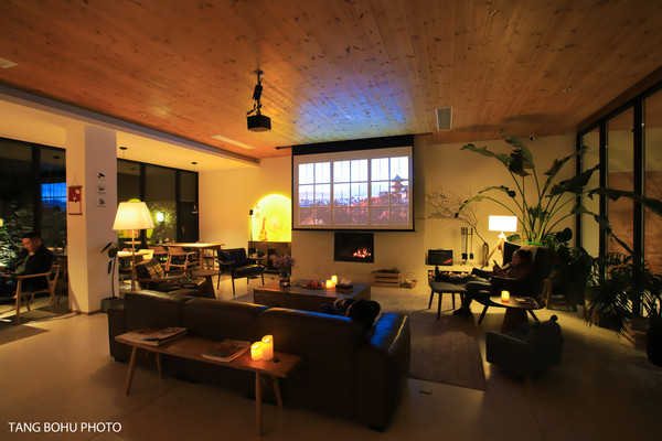 整个室内的灯光是温馨的暖色调,让人一下子放松下来,客厅里的真皮沙发,还有投影屏幕,最吸引我的是壁炉,而且是用柴火烧的,像冬天的时候外面下着雪在这里烤壁炉真的是温暖呀。还放着一些书,旁边还有咖啡红酒等,很温馨的客厅,在这里一起和朋友看看电影,聊聊天,真是惬意。