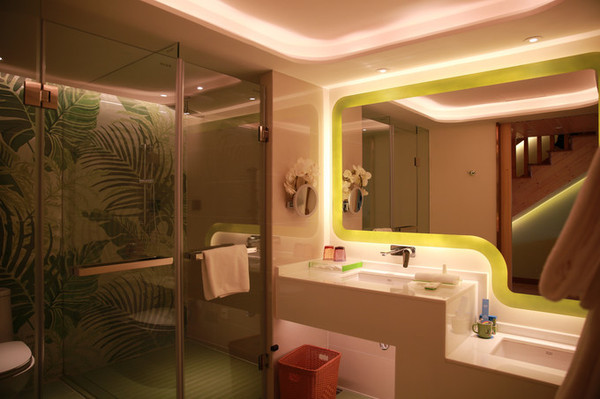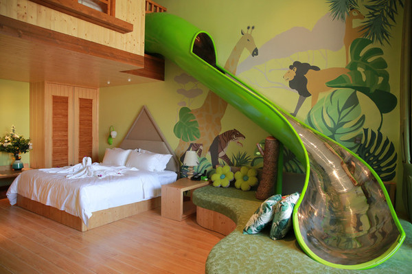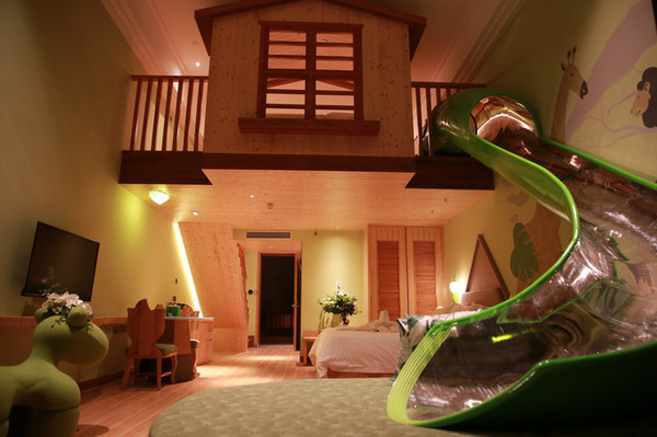 这么多年来大江南北到处跑,住过无数的酒店,但是如此特别的亲子房设计,还是头一次体验。 绿色调的是丛林探险主题复式亲子房。