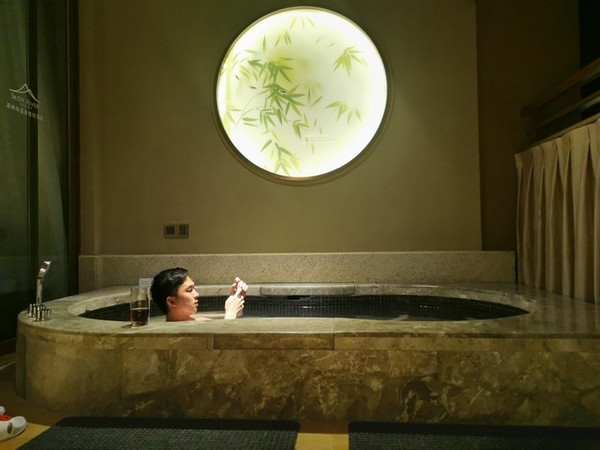 「酒店温泉区总面积达到13000㎡,源自高滩养生温泉,泉水为弱碱性,达到“国家医疗矿泉水标准”,富含多种对人体健康有益的微量元素,可养颜美容、舒缓神经紧张,具有辅助治疗神经痛、皮肤病、银屑病、关节炎等多种功效。」