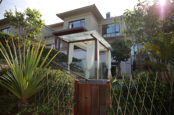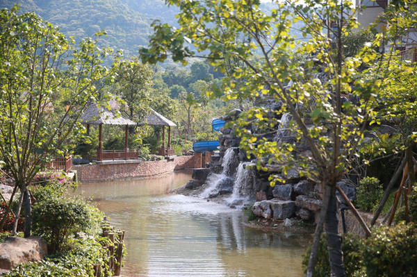 别墅区与户外温泉区之间的人工瀑布景观