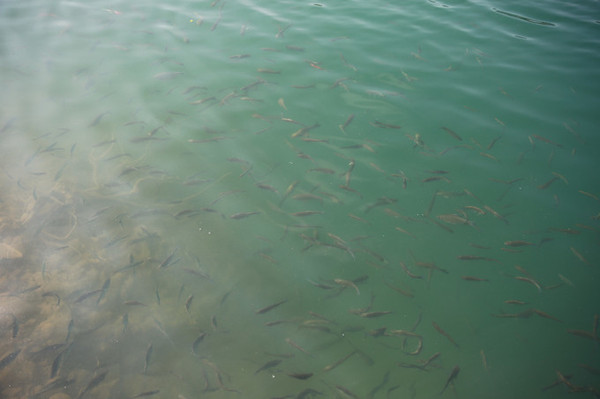 湖水清澈见底,岸边有许多小鱼聚集在一起游来游去