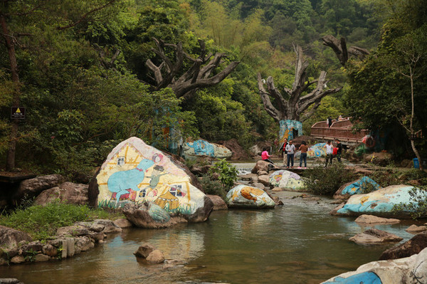 一路上很多石头喷了可爱的彩绘图