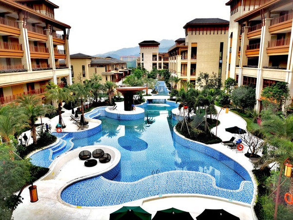 独具匠心的东南亚设计风格,外观大气恢宏,内饰低调奢华,水上威尼斯泳道穿绕一楼客房门前,推门即可跃进泳池,纯天然温泉入户私密体验等配置,让酒店拥有与众不同的特色。