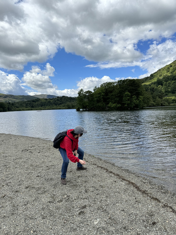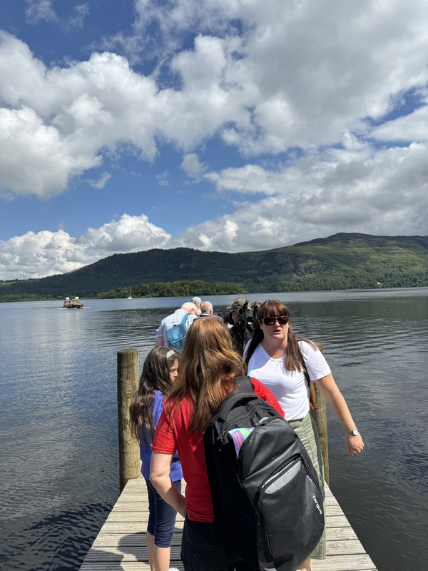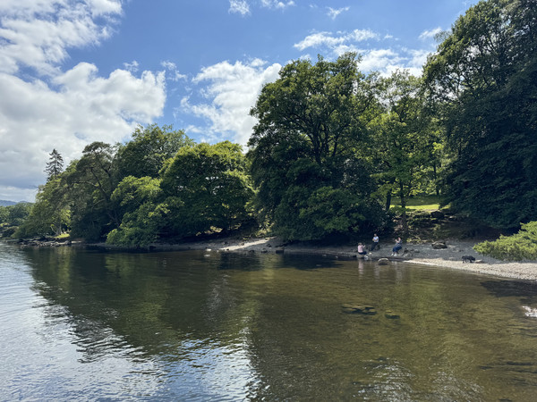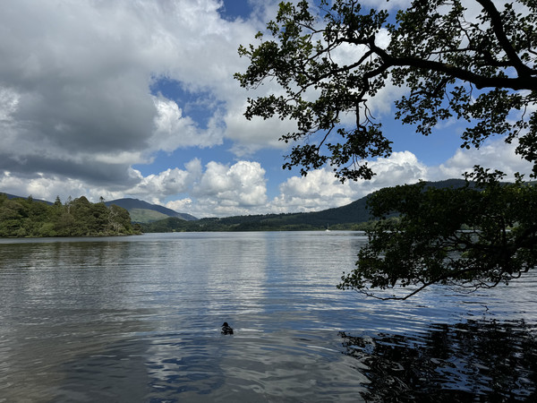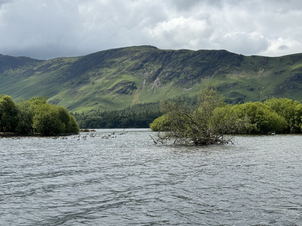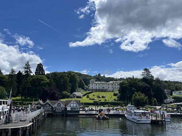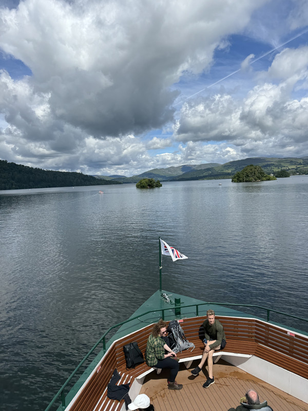 下车后穿过Hope Park就可以看到码头。Ticket booth里的大爷随手一指说那个就是下一班船,不像在Bowness码头还有船次和码头号码的信息板。游船分顺时针和逆时针方向,根据自己的时间选就好了。湖水时而波澜时而平静,老式游船上随风飘荡的英国国旗点缀着岸边的绿树葱葱,让人心旷神怡。坐船在湖上游一圈确实不失为湖区出游行程上的浓重一笔。阳光灿烂,我们在船上被打上来的水扑了一阵阵的,大家都尽情享受,听着水声看树枝摇曳,时光还能再惬意一些吗?!