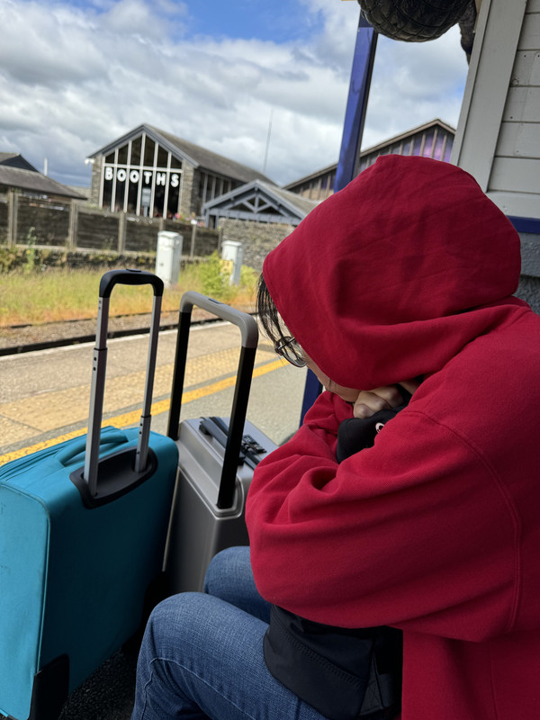 丝滑入境后,我从曼彻斯特机场T2到曼彻斯特机场火车站步行约10分钟,提前购买车票,一次换乘,共2.5小时就可以到Windermere火车站。曼彻斯特火车站发车的最早一班火车是9点05出发。在Oxenholme换乘时和女儿相聚。在站台上她就迫不及待地品尝起我从上海带去的零食。