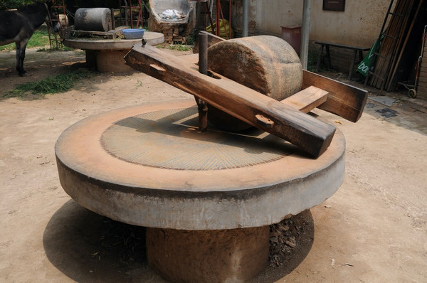 前几年这个石磨是一头蒙着眼睛的驴在拉着转,现在估计光荣退休颐养天年去了~