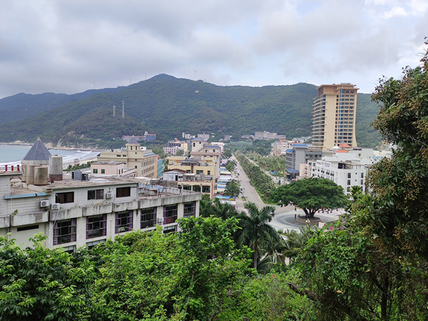 站在观音山顶俯瞰王府洲度假区:洁白的沙滩被椰林绿树环抱、半月形的海湾、柔软的沙滩、海风椰林、渔村落霞、美不胜收。