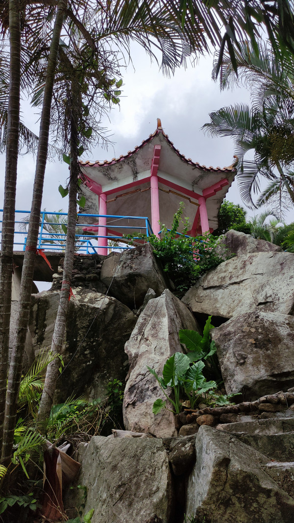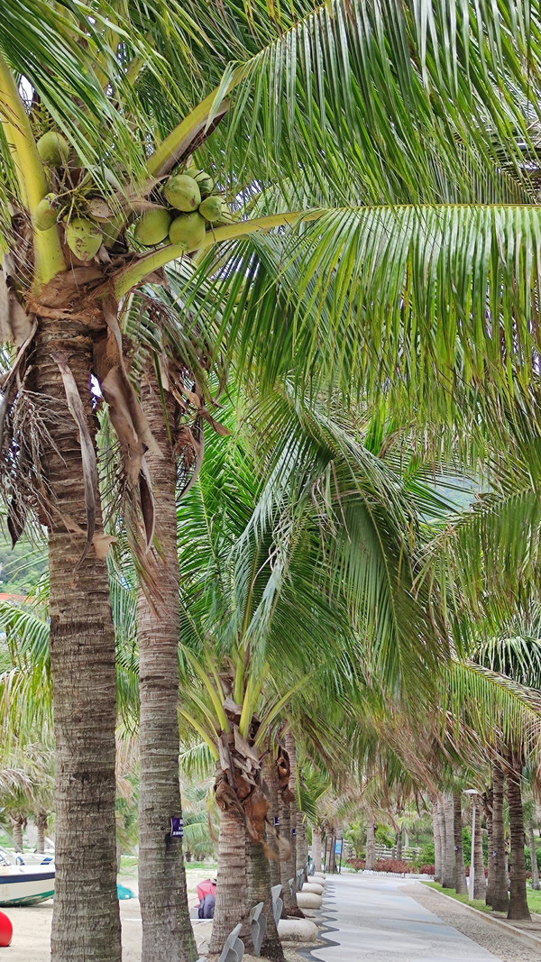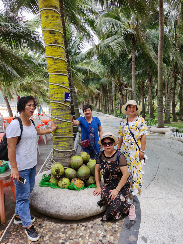 九点半,早餐之后,我们登上观音山,俯瞰整个下川岛王府洲旅游区,美不胜收,风光旖旎:阳光、大海、沙滩、椰林、小镇和谐美好,海边那片茂密的椰林深深吸引了我,炎炎夏日漫步椰林情人路,吹着海风、听着涛声、喝着新鲜、清甜的椰汁,好美的感觉,真想一直走下去。。。