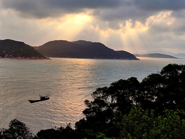 来到大湾观景台,见到太阳光透过乌云撒向海面,好美!乌云是遮不住太阳的!