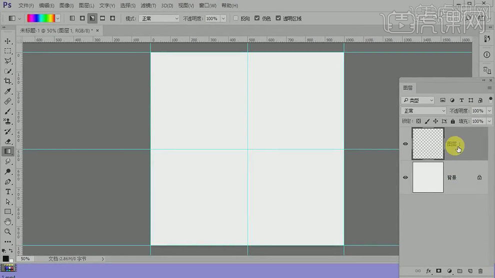 11.【打开】PS软件,【新建】任意大小的画布,【新建】图层,拖出辅助组确认中心点位置。具体效果如图示。