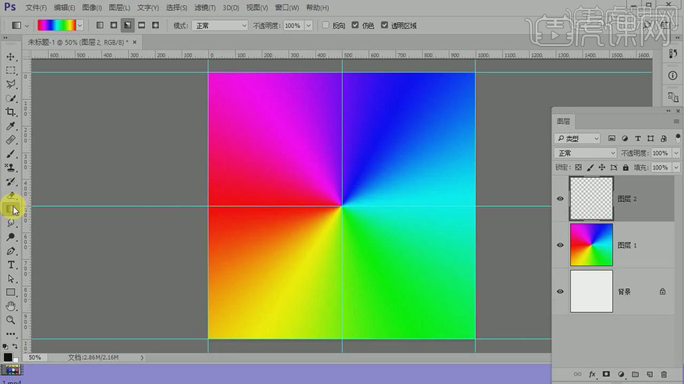 12.使用【渐变工具】,【选择】五彩颜色,【渐变模式】角度渐变,从中心点拖出渐变颜色。具体效果如图示。