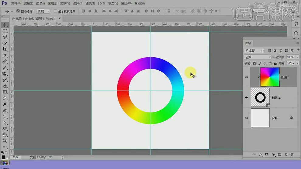 13.【新建】图层,使用【自定义形状工具】-【圆环形状】,在画面拖出合适大小的圆环,放置画面的中心点。调整图层顺序,【选择】渐变图层,按Alt键单击【创建剪切蒙版】。具体效果如图示。