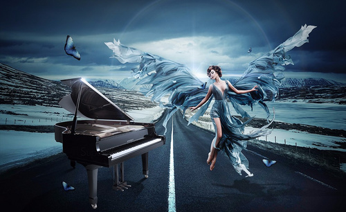 1、【打开】PS软件,【新建】画布,【拖入】背景和钢琴,将人物使用【钢笔工具】将人物抠出。拉出中心参考线,注意背景图片的位置和大小。