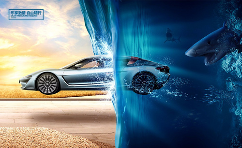 4. 为“汽车”层【添加图层蒙版】,使用【钢笔工具】沿海面轮廓勾勒,按【Ctrl+Enter】路径转换为选区,使用黑色【画笔工具】在选区左侧涂抹,降低画笔【不透明度】36%、【流量】30%,继续涂抹选区;将“鲨鱼”素材【拖拽】到画布中,调整【位置】到汽车右上角,按【Ctrl+T】自由变换放大;将“后面的鲨鱼”素材【拖拽】到画布中,按【Ctrl+T】自由变换缩小;将“鱼群”素材【拖拽】到画布中,按【Ctrl+T】自由变换大小。