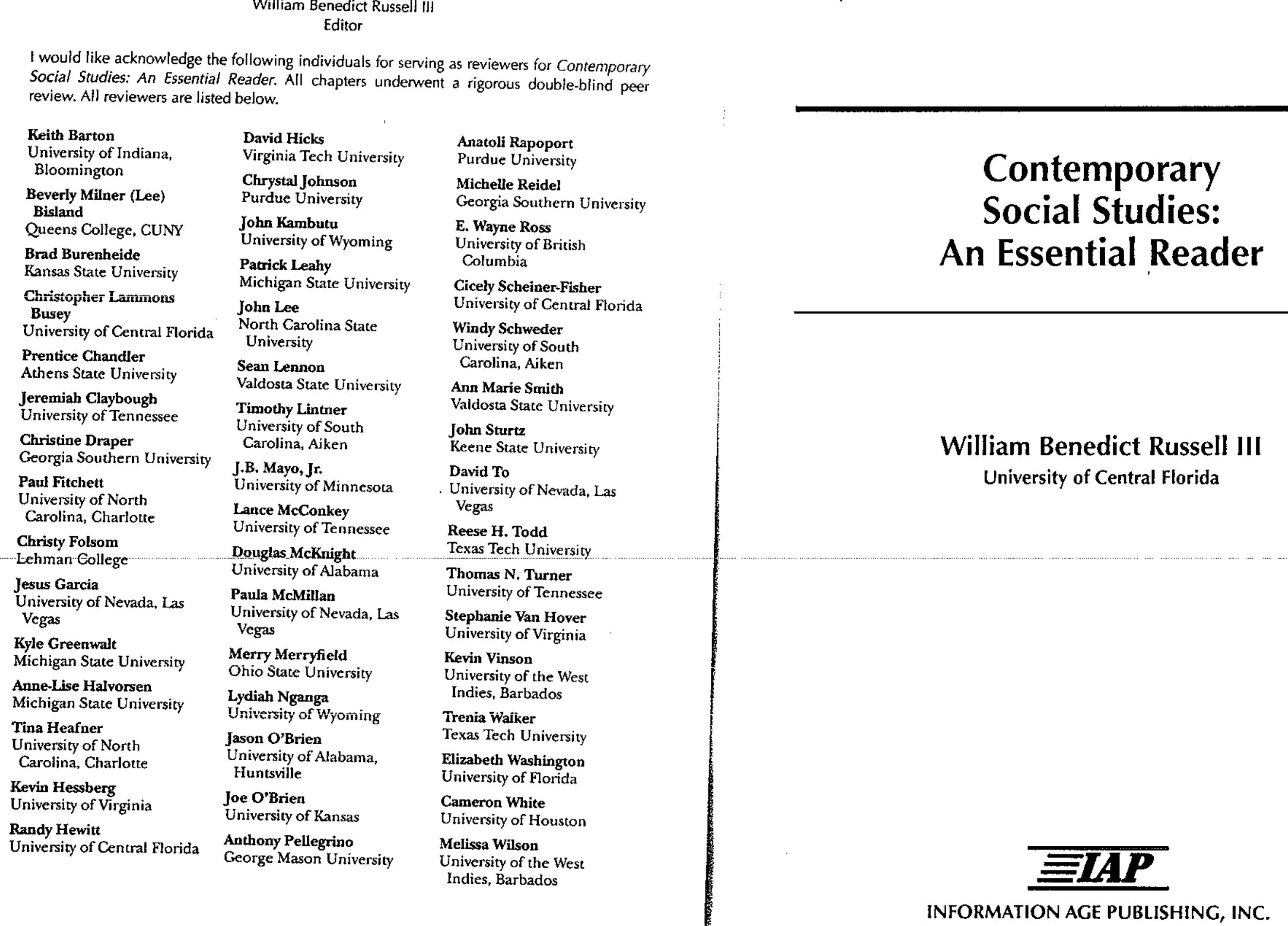 In this chapter we explore social studies education and SBER from a variety of perspectives and on a variety of levels. We begin by over/reviewing the nature and meaning of SBER, defining the term, for example, and briefly introducing its recent history, particularly vis-à-vis national public school policy work and the work of those national commissions and “blue ribbon” panels that influenced its development and evolution (e.g., The National Commission on Excellence in Education’s 1983 publication A National at Risk: The Imperative for Educational Reform) and legislation such as the President Bush’s No Child Left Behind Act of 2001 (NCLB) and President Obama’s “Race to the Top.” Second, we frame social studies education itself within the larger milieu of SBER, focusing primarily upon the curriculum standards work of the National Council for the Social Studies (NCSS). We consider here the creation and influence of such significant documents as Charting a Course and Expectations of Excellence: Curriculum Standards for Social Studies. Third, we introduce and explicate the continuing debate surrounding social studies education and SBER, first with respect to the widely publicized debate over National History Standards and second with respect to more recent NCLB-inspired critique. We present, of course, both the pro-SBER and anti-SBER perspectives. And fourth, we situate the present status of social studies education in terms of SBER. We conclude by considering the “big picture” of what all of this might mean for contemporary and future social studies education, particularly in terms of purpose, curriculum, instruction, teaching methodologies, assessment, teacher education, and policymaking.""