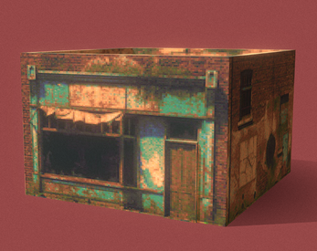 A PSX-style abandoned shop cube featuring rusted walls, shattered storefront glass, and faded signage. Ideal for retro city streets, survival maps, horror scenes, and lowpoly environmental dressing with strong atmosphere.