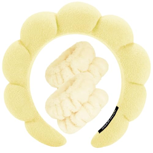 Spa Headbands for Washing Face Wristband Set Sponge Makeup Skincare Headband Wrist Towels Bubble Soft Terry Towel Cloth Hairband for Women Puffy Headwear Non Slip Thick Thin Hair Headwear (Yellow)