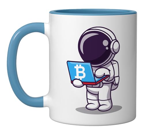 Astronaut buying ticket to the moon with BTC Bitcoin Ceramic Mug, Blue/White