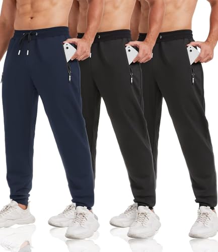 lomsoe 3 Pack Sweatpants for Men Tapered Mens Joggers Pants with Zip Pockets Slim Fit Running Gym Sweat Pants Gifts for Men