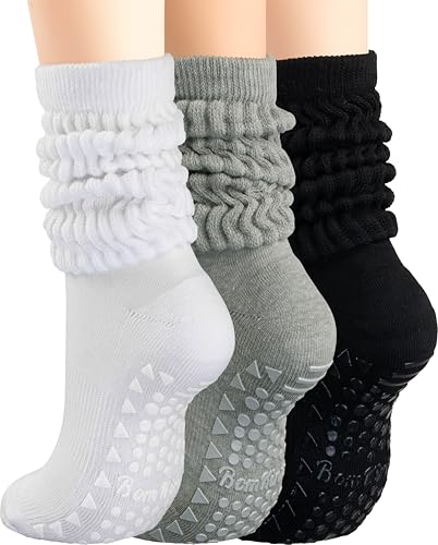 BomKinta Pilates Socks with Grips for Women Yoga Grippy Slouch Scrunch Sock Slipper Socks for Barre Workout Hospital Gifts Size 5-11 3 Pairs Black White Grey