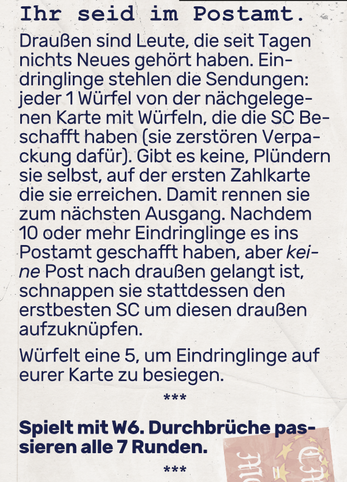 In diesem kurzen "Montags Geschlossen"-Szenario seid ihr die Beamten in einer Poststation, die seit Tagen keine Post mehr ausgeliefert hat. DrauÃen warten SEHR ungeduldige Leute auf ihre Briefe. Bald werden sie reinkommen und dabei wohl kaum das Briefgeheimnis wahren, oder eure Sicherheit. Findet also hurtig die Postkutsche, und fangt an auszutragen!