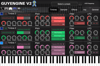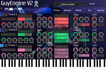 - 2 ADDITIONAL TIMBRES - GuyEngine is MULTITIMBRAL, with a grand total of 3 timbres. All 3 timbres are equipped with sample selection, pan, volume, pitch, ADSR, LFO, MIDI channel, Low pass and high pass filters. Play 3 instruments at once, or combine them and create your own sounds!