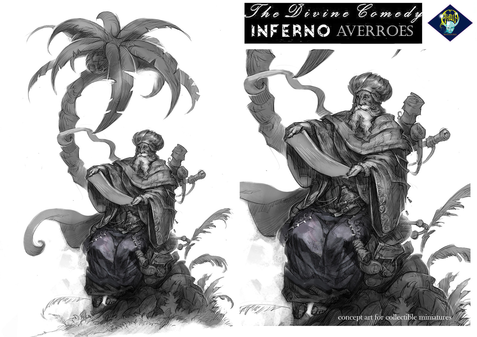 I'm personally very attached at this subject, cause even if it's not as complex and spectacular as a demon or a diorama, the character of philosopher Averroes is (historically) the translator of Aristotle At Syrian Christian Community. And ther's strong possibilities the iteration of Aristotle That Dante studied, belong from Averroes contribution. And we know now how much Aristotle philosophy influenced Dante...This way I imagined Averroes, under the shadow of a palm tree, translating Aristotle...and this subject is a tribute to Averroes, as a stunning philosopher.