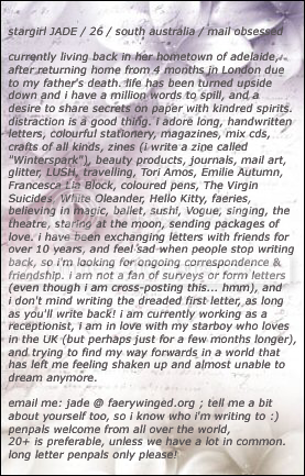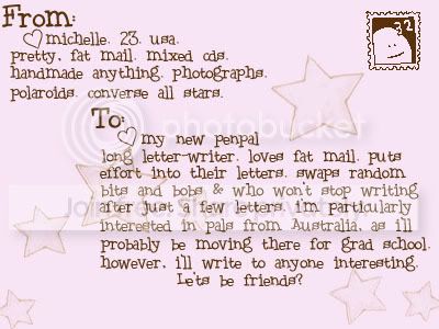Name: Samantha, but I go by Sammi. Age: 18 Astrological Sign: Virgo Country: U.S.A. Taken or Single: Single :( Career or Future Career: I'm not sure right now. I'm a freshman in college in NYC and my major is Communications. Main interests: photography, art (my favorite artist is Andy Warhol), music, fashion, friends, tv, movies, burts bees, pop art, candles, shopping, living in new york, raspberry/green tea, peppermint bark, sushi, jamba juice etc Favorite music:80's music, Juliette & The Licks, Bright Eyes, Taking Back Sunday, White Stripes, RHCP, Lily Allen, The Cure, Velvet Underground, Liz Phair,Angels & Airwaves, Belle & Sebastian, Blondie, The Cranberries, Dashboard Confessional, Fiona Apple, Fleetwood Mac, Garbage, Goldfrapp, Scissor Sisters, Gwen Stefani/No Doubt, Horrorpops, Jenny Lewis/Rilo Kiley, Keane, KT Tunstall, Pearl Jam, Regina Spektor, The Shins, Snow Patrol, Tegan and Sara, The Yeah Yeah Yeah's, Cyndi Lauper, Death Cab for Cutie, Arctic Monkeys, Aqualung, The Clash, Bob Marley, Journey, Goo Goo Dolls, Oasis, Joni Mitchell, Patti Smith Favorite books: I like the Nanny Diaries, and Shrimp and Gingerbread. Novels: not into novels. Favorite movies: Molly Ringwald's classics (pretty in pink, 16 candles, breakfast club)The Holiday, A lot like love, girl interrupted, edward scissorhands, almost famous, click, say anything, 13 going on 30, how to deal, flash dance, big, dirty dancing, practical magic, don't tell mom the babysitter's dead, heathers, riding in cars with boys, gremlins, the family stone, donnie darko, reality bites, now and then, pleasantville,Walk the line, back to the future part 1 and 2,In her shoes, High Fidelity, Night at the Roxbury, Clueless, Elizabethtown,Stepford Wives and tons more. Favorite TV show/movie's: Miami Ink, Wife Swap, Trading Spouses, Nanny 911, Supernanny, all the vh1 celebrity gossip shows, I Love New York, Gilmore Girls, Sex and the city, Absolutely Fabulous, Married with children, The Simple Life, (anything on the food network except iron chef and good eats, I LOVE GIADA DE LAURENTIIS AND PAULA DEEN)Weeds, Girls Behaving Badly, Campus Ladies,The Chapelle Show, Kathy Griffin: My Life on the D-list, Roseanne, Andy Milonakis, The Girls Next Door, My Super Sweet 16, Real World Denver, What Not To Wear, Little People: Big World, Favorite Animal(s): dogs, ferrets, and ducks. Describe your ideal penpal: I care more about content than appearance (however, a cute letter is a plus!) - the person must be willing to write frequently. I also like sending pictures and random things such as stickers, mix tapes, etc. So if that person is willing to do the same, thatd be awesome. What age do you want them to be? I'm 18, so my age limit would be 17-22. What sex do you want them to be? Preferably female, I've never had a male penpal before and that could be fun too. Anything you would like to add: I've been penpalling since 2003, so this is not anything new to me. I love writing letters, my letters are filled with colorfulness, stickers, and long conversation :) I normally don't write first, but I do make exceptions.