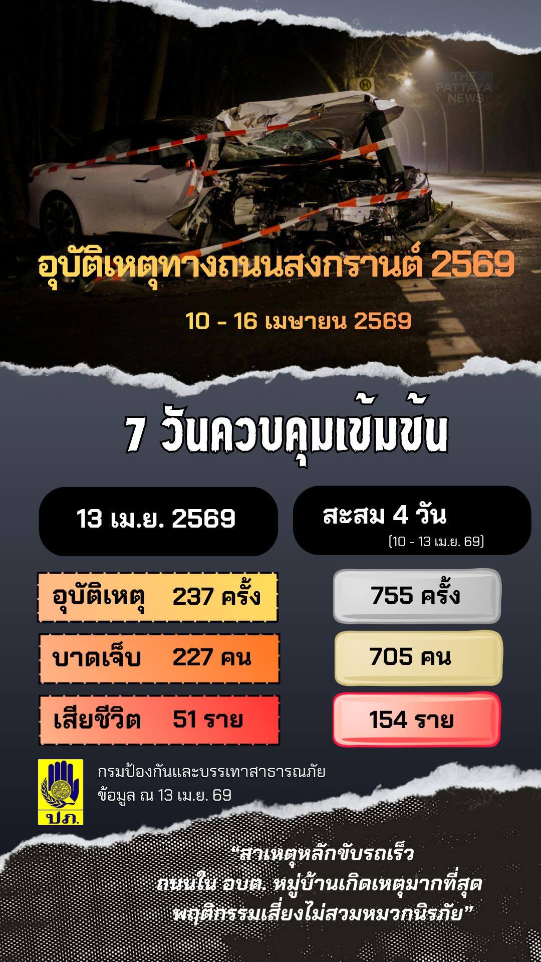 Thailand has reported a total of 755 accidents, resulting in 705 injuries and 154 fatalities over four days (April 10th – April 13th) of the Songkran Seven Days of Danger Road campaign which runs from April 10 to 16, 2026.