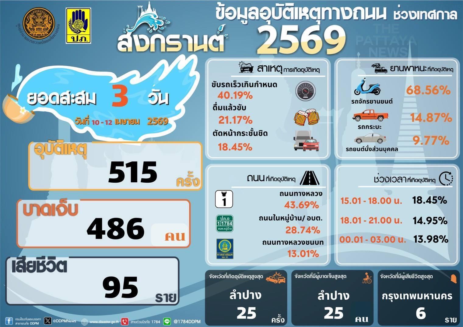 Thailand has reported a total of 515 accidents, resulting in 486 injuries and 95 fatalities over three days (April 10th – April 12th) of the Songkran Seven Days of Danger Road campaign which runs from April 10 to 16, 2026.