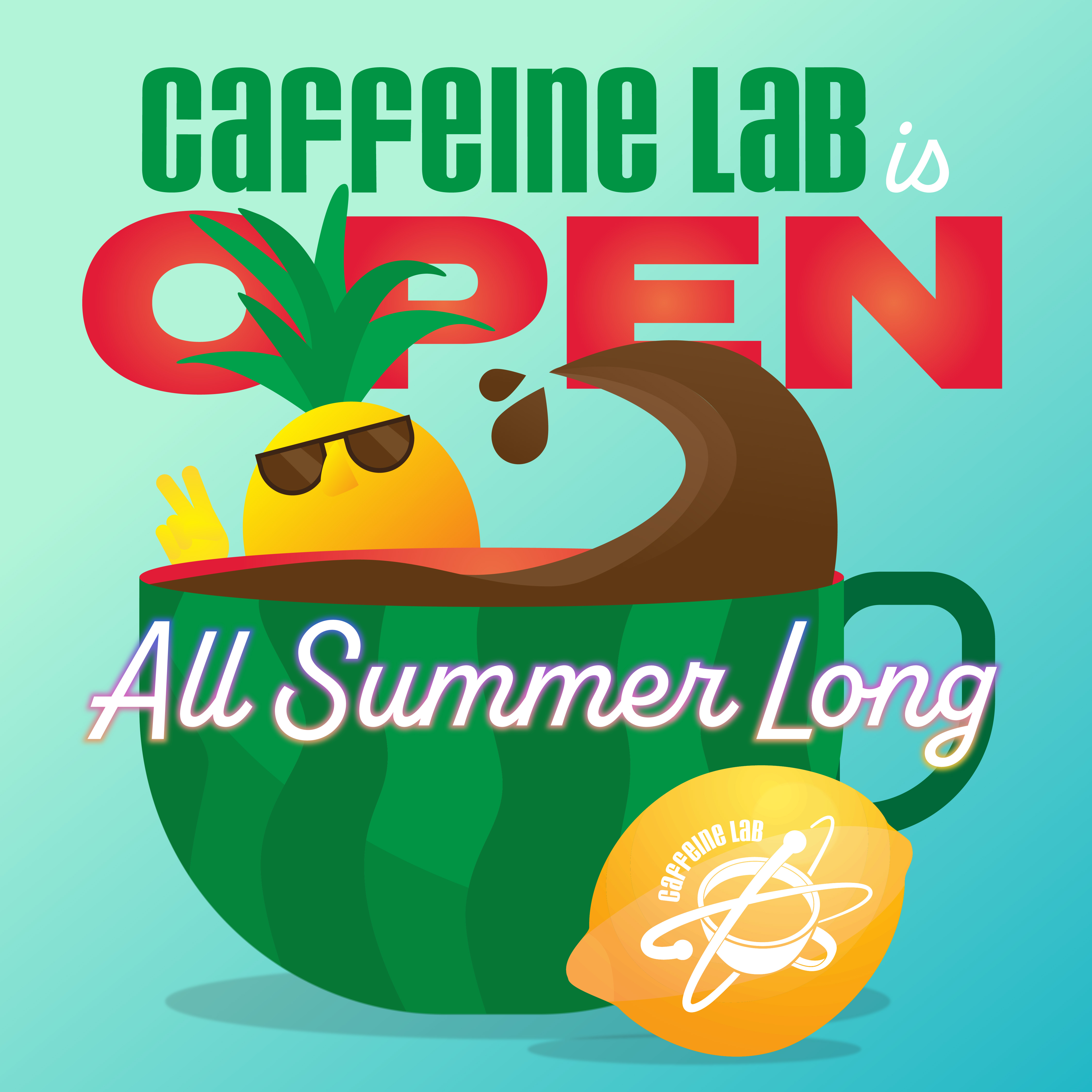 A post to let students know that Caffeine Lab, a cafe on campus, is open during the summer break