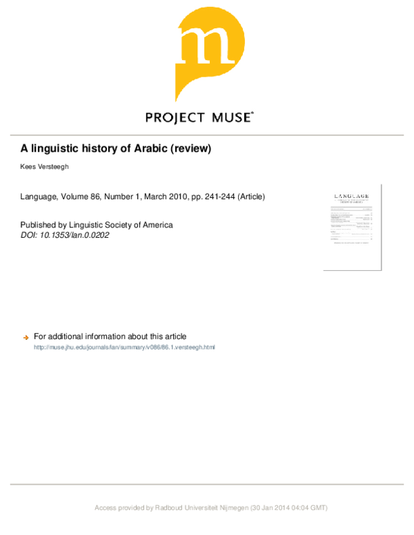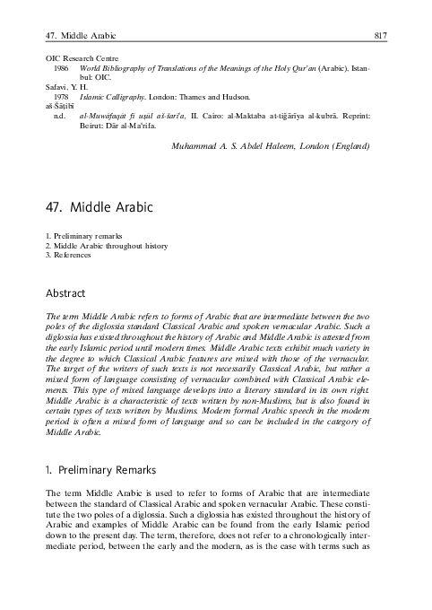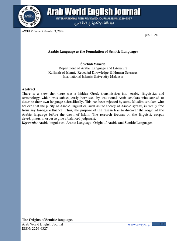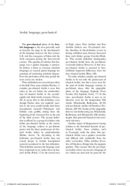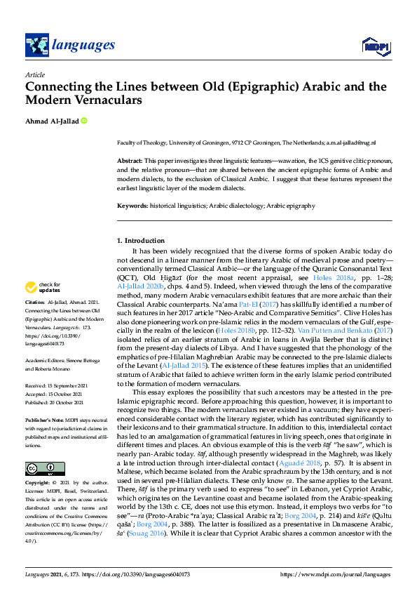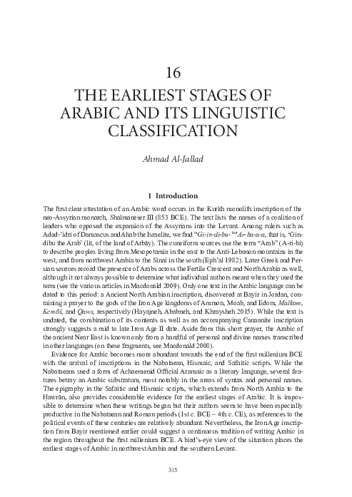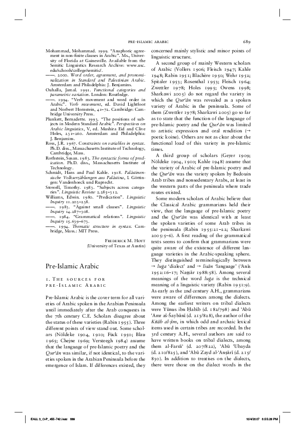 Al-Jallad, A., 2014. On the genetic background of the Rbbl bn Hfʿm grave inscription at Qaryat al-Fāw. Bulletin of the School of Oriental and African Studies, 77, 445-465.Al-Jallad, A., 2015. An Outline of the Grammar of the Safaitic Inscriptions. Leiden: Brill.Al-Jallad, A., 2017. Graeco-Arabica I: The Southern Levant. In: A. Al-Jallad ed. Arabic in Context, Cel- ebrating 400 years of Arabic at Leiden. Leiden: Brill, 99-186.Al-Jallad, A., forthcoming. The word, the blade, and the pen: three thousand years of Arabic. Princeton, NJ: Princeton University Press.Al-Jallad, A., In preparation. The Hismaic Inscriptions.Al-Jallad, A., Al-Ghul, O., and Daniel, R., 2013. The Arabic toponyms and oikonyms in 17. In: L. Koenen, J. Kaimio, M. Kaimio, and R. Daniel, eds. The Petra Papyri II. Amman. ACOR, 23-48.Al-Jallad, A. and al-Manaser, A., 2015. New epigraphica from Jordan I: a pre-Islamic Arabic inscription in Greek letters and a Greek inscription from north-eastern Jordan. Arabian Epigraphic Notes, 1, 51-70.Beeston, A. F. L., 1981. Languages of Pre-Islamic Arabia. Arabica (numéro special double: Études de linguistique arabe), 178-186.Bellamy, J., 1990. Arabic verses from the 1st/2nd century: the inscription of ʿEn ʿAvdat. Journal of Semitic Studies, 35 (1), 73-79.El-Sharkawy, M., 2014. Pre-Islamic Arabic. In: L. Edzard and R. Jong, eds. Encyclopedia of Arabic lan- guage and linguistics (ONLINE). Brill Online, 2014. Reference. Universiteit Leiden. 09 July 2014.Eph'al, I., 1982. The ancient Arabs: Nomads on the borders of the Fertile Crescent 9th-5th Centuries B.C. Jerusalem/Leiden: Magnes/Brill.Farès-Drappeau, S., 2005 Dédān et Liḥyān: Histoire des Arabes aux confins des pouvoirs perse et hellé- nistique (IVe -Iie avant l'ère chrétienne) (Travaux de la maison de l'orient et de la Méditerranée 42) Lyon: Maison de l'Orient et de la Méditerranée.Fiema, Z.T., Al-Jallad, A., Macdonald, M.C.A., and Nehmé, L., 2015. Provincia Arabia: Nabataea, the emergence of Arabic as a written language, and Graeco-Arabica. In: G. Fisher, ed. Arabs and empires before Islam. Oxford: Oxford University Press, 276-373.Graf, D. F. and Zwettler, M. J., 2004. The North Arabian "Thamudic E" inscriptions from Urayniba West. Bulletin of the American Schools of Oriental Research, 55, 53-89.Gzella, H., 2011. Northwest Semitic in general. In: S. Weninger, G. Khan, M. Streck, and J. Watson, eds. The Semitic languages: an international handbook, (Handbücher zur Sprach-und Kommunikation- swissenschaft 36). Boston-Berlin: De Gruyter Mouton, 425-451.Hayajneh, H., 2011. Ancient North Arabian. In: S. Weninger, G. Khan, M. Streck, and J. Watson, eds. The Semitic languages: an international handbook, (Handbücher zur Sprach-und Kommunikationswis- senschaft 36). Boston-Berlin: De Gruyter Mouton, 756-782.Hayajneh, H., Ababneh, M. I. and Khraysheh, F., 2015. Die Götter von Ammon, Moab und Edom in einer neuen frühnordarabischen Inschrift aus Südost-Jordanien. In: V. Golinets, H. Jenni, H.-P. Mathys, and S. Sarasin, eds. Fünftes Treffen der Arbeitsgemeinschaft Semitistik in der Deutschen Morgenlän- dischen Gesellschaft vom 15. -17. Februar 2012 an der Universität Basel (Münster, Ugarit-Verlag) 79-105.Hetzron, R., 1974. La division des langues sémitiques. In: A. Caquot and D. Cohen, eds. Actes du Pre- mier Congrès International de Linguistique Sémitique et Chamito-Sémitque, Paris 16-19 juillet, 1969. The Hague, Paris: Mouton, 181-194.Hetzron, R., 1975. Genetic classification and ethiopian Semitic. In: J. Bynon and T. Bynon, eds. Hamito- Semitica. The Hague: Mouton, 103-127.Hetzron, R., 1976. Two principles of genetic reconstruction. Lingua, 38, 89-104.Huehnergard, J., 1987. Stative, predicative, pseudo-verb. Journal of Near Eastern Studies, 46, 215-232.Huehnergard, J., 2005. Features of central Semitic. In: A. Gianto, ed. Biblical and oriental essays in memory of William L. Moran. Rome: Pontificio Istituto Biblico, 155-203.Huehnergard, J., 2008. Afro-Asiatic. In: R. D. Woodard, ed. The ancient languages of Syria-Palestine and Arabia. Cambridge: Cambridge University Press. 225-246Huehnergard, J., 2017. Arabic in its Semitic context. In: A. Al-Jallad, ed. Arabic in context, celebrating 400 years of Arabic at Leiden. Leiden: Brill, 3-34.Huehnergard, J. and Rubin, A., 2011. Phyla and Waves: models of classification of the Semitic lan- guages. In: S. Weninger, G. Khan, M. Streck, and J. Watson, eds. The Semitic languages: an interna- tional handbook (Handbücher zur Sprach-und Kommunikationswissenschaft 36). Boston-Berlin: De Gruyter Mouton, 259-278.Knauf, E., 2010. Arabo-Aramaic and ʿArabiyya. From ancient Arabic to early standard Arabic, 200 CE -600 CE. In: A. Neuwirth, N. Sinai, and M. Marx eds. The Qurʾān in context. Historical and iterary investigations into Qurʾānic ilieu, Leiden (Texts and studies on the Qurʾān 6). Leiden: Brill, 197-254.Kogan, L., 2011. Proto-Semitic phonetics and phonology. In: S. Weninger, G. Khan, M. Streck, and J. Watson, eds. Semitic languages. An international handbook, Berlin, Boston (Handbücher zur Sprach- und Kommunikationswissenschaft 36), 54-151.Kootstra, F., 2016. The language of the Taymanitic inscriptions and its classification. Arabian Epigraphic Notes 2: 67-140.Macdonald, M. C. A., 2000. Reflections on the linguistic map of pre-Islamic Arabia. Arabian Archaeol- ogy and Epigraphy, 11, 28-79.Macdonald, M. C. A., 2004. Ancient North Arabian (Chapter 16). In: R. D. Woodard, ed. The Cambridge encyclopedia of the world's ancient languages. Cambridge, New York: Cambridge University Press, 488-533.Macdonald, M. C. A., 2008. Old Arabic. In: K. Versteegh, ed. Encyclopedia of Arabic language and linguistics. Vol. III (Lat-Pu). Leiden: Brill, 464-474.Macdonald, M. C. A., 2009. Literacy and identity in pre-Islamic Arabia. Surrey: Ashgate.Macdonald, M. C. A., ed., 2010. The development of Arabic as a written language. Supplement to the Proceedings of the Seminar for Arabian Studies Vo