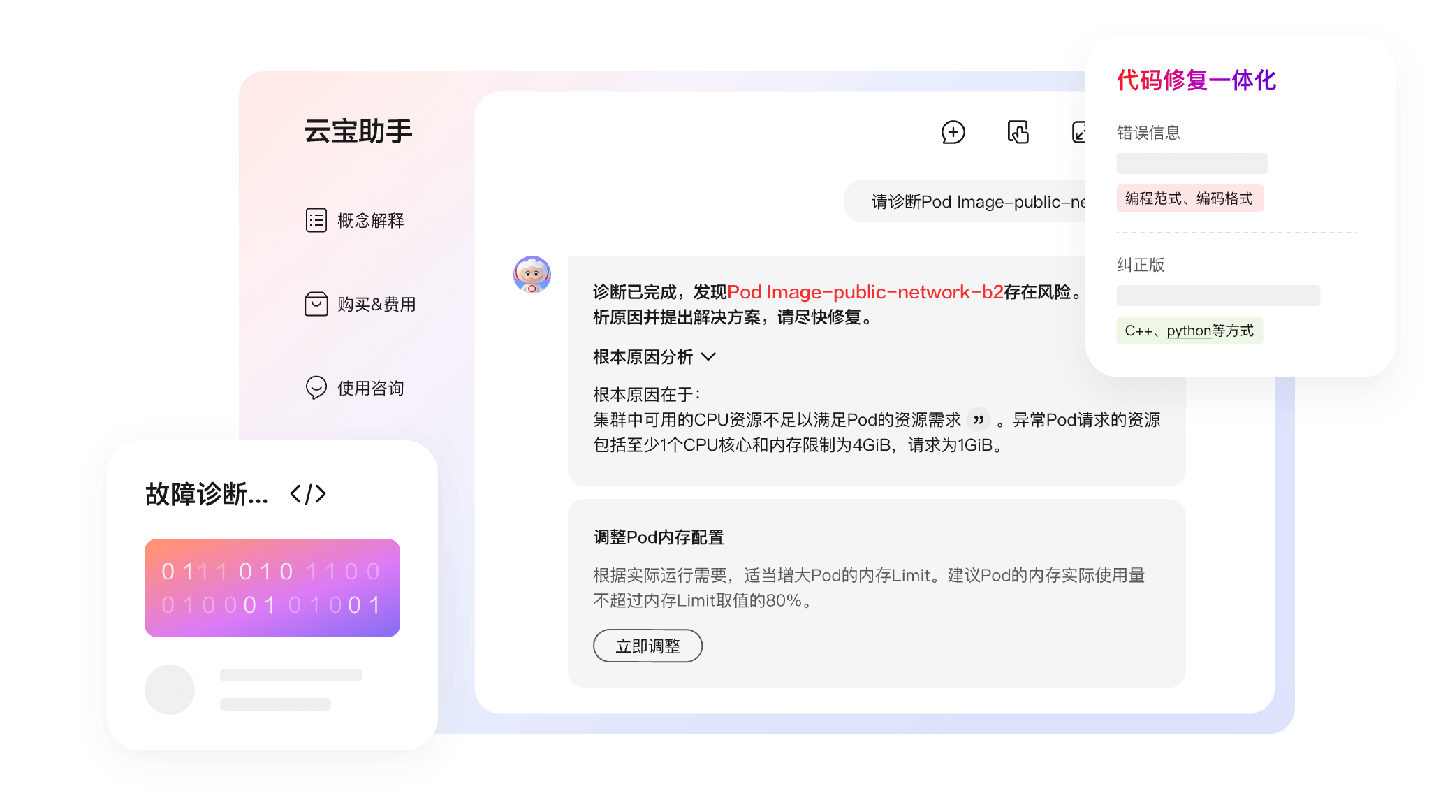 云宝助手的智能诊断能力可实时获取您的服务故障信息,一键智能诊断故障根因,并给出您建议的个性化恢复方案。
