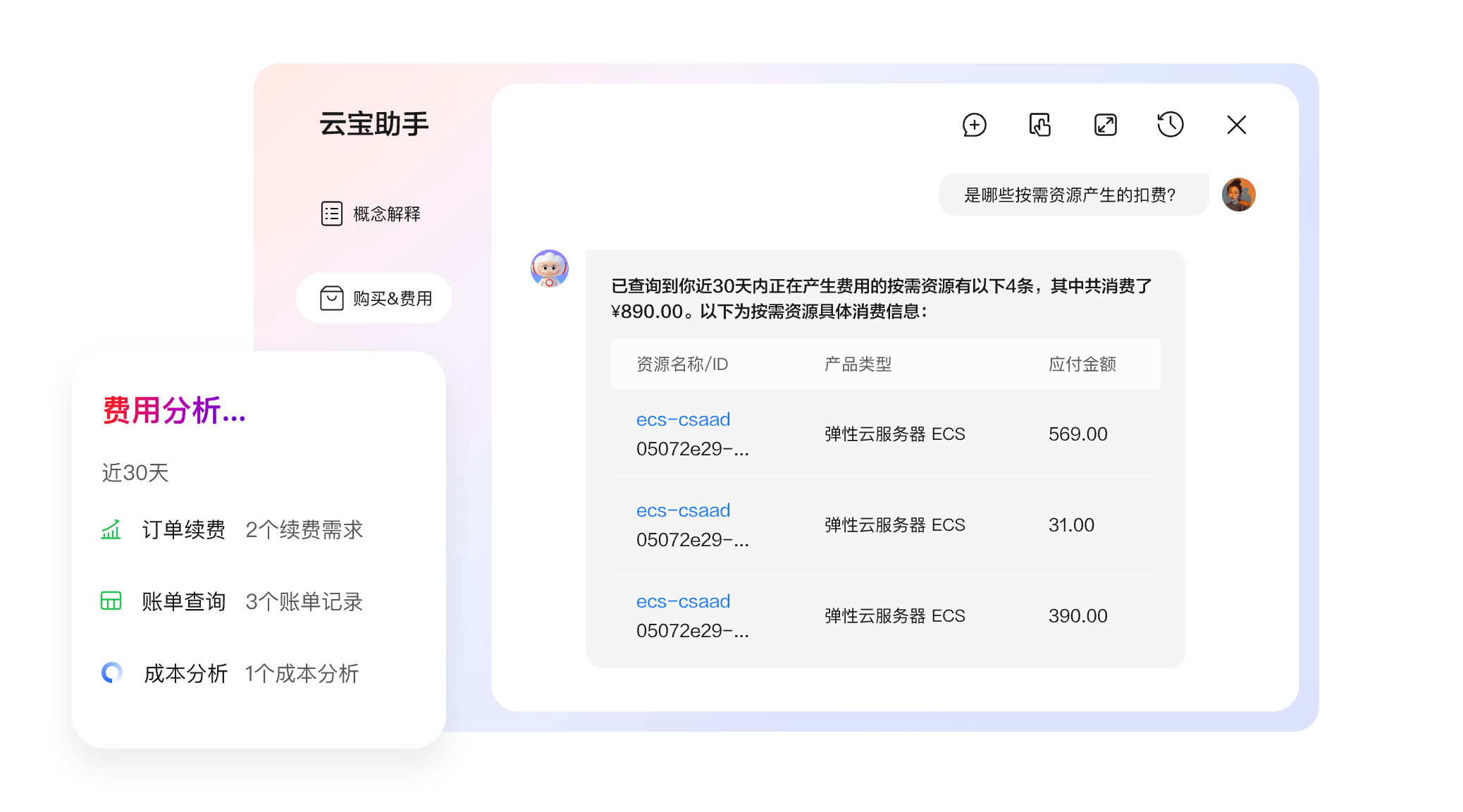 提供对话式费用成本管理功能,涵盖订单续费、退订及账单查询、导出、对账与溯源等服务,助您轻松掌控相关动态。