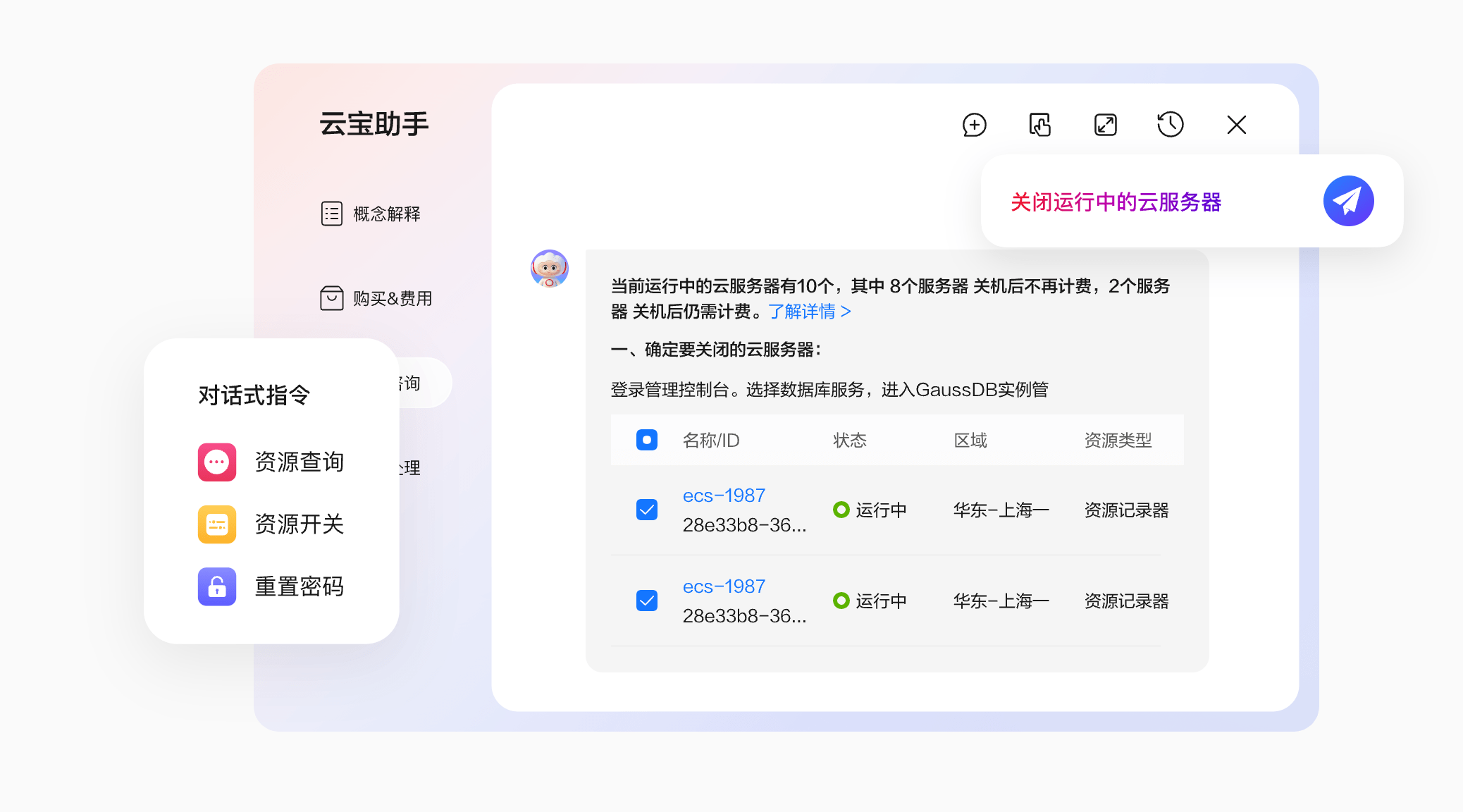 可快速查询我的资源,及时获取资源数量和消单。对话式下达指令完成资源打开、关闭、重启等操作,资源管理更方便快捷。
