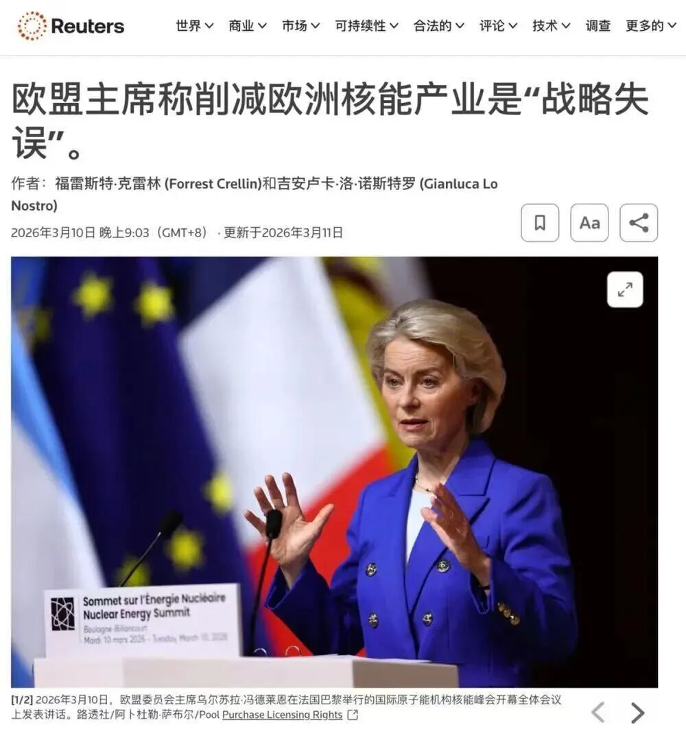 前几天,欧盟主席反思削减核能是“战略失误”,而其中德国是减得最彻底的,也是最后悔的。