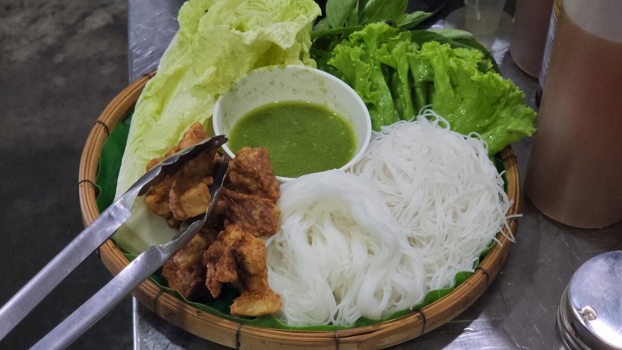 หมูลงทอดสุกให้เสมอกันเสิร์ฟพร้อมผักสด น้ำจิ้มซีฟู้ด ทานเคียงคู่กับเส้นหมี่ เส้นขนมจีน ผักกาดหอม ผักกาดขาว ใบโหระพา และผักชีฝรั่ง ยังถือเป็นอีก 1 เมนูสุขภาพ เพราะได้ทานเคียงกับผักสดๆ