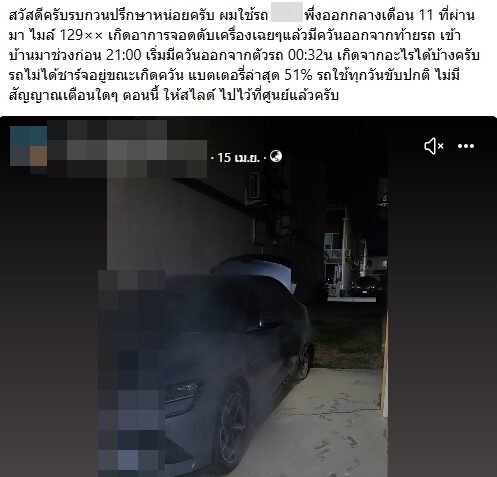 โดยเจ้าของรถ ได้โพสต์ขอคำปรึกษา โดยบอกว่า รถคันดังกล่าวเพิ่งออกมาเมื่อเดือน พ.ย.68 เลขไมล์อยู่ที่ 12,9xx กม. ซึ่งเจ้าของรถได้ขับเข้ามาที่บ้านในเวลา 21.00 น. และแบตเตอรี่อยู่ 51% แล้วจอดไว้โดยไม่ได้เสียบชาร์จไฟไว้แต่อย่างใด