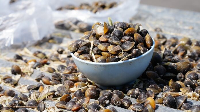 Using rake-like tools, villagers spend hours dragging along the lakeshore to collect the clams before cleaning them thoroughly and soaking them in water for about six hours. The clams are then mixed with crushed lemongrass, shallots, garlic and spices, salted and left to marinate overnight.