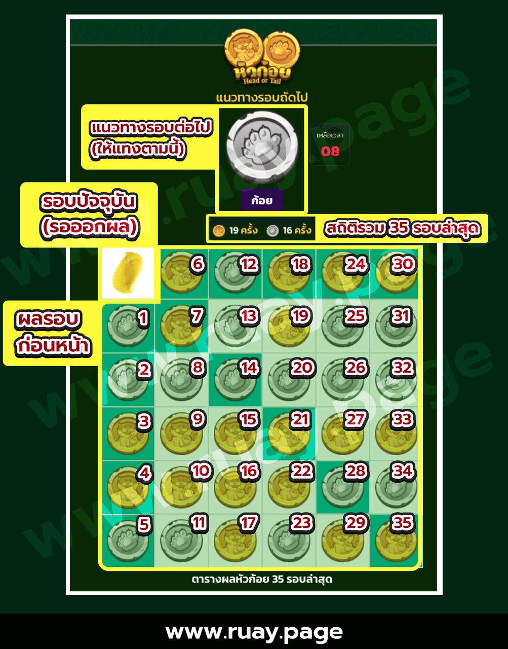 - ดูแนวทางรอบถัดไป ว่าสูตรนั้นให้แทง “หัว” หรือ “ก้อย“