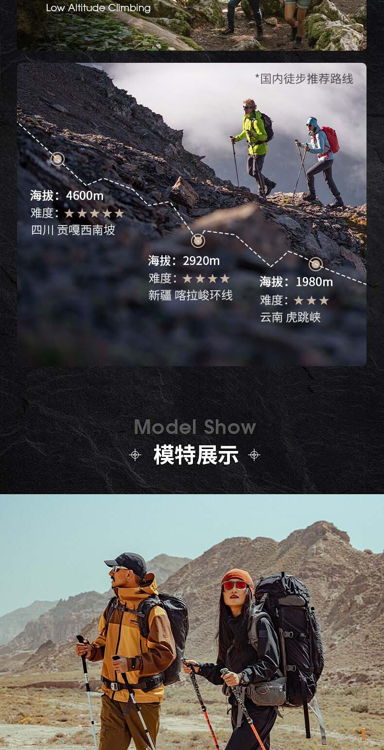 使用场景:重装徒步、山地穿越、中低海拔雪山攀登、近郊登山、碎石坡 / 泥泞路复杂地形穿越、户外露营、日常通勤