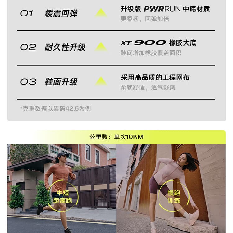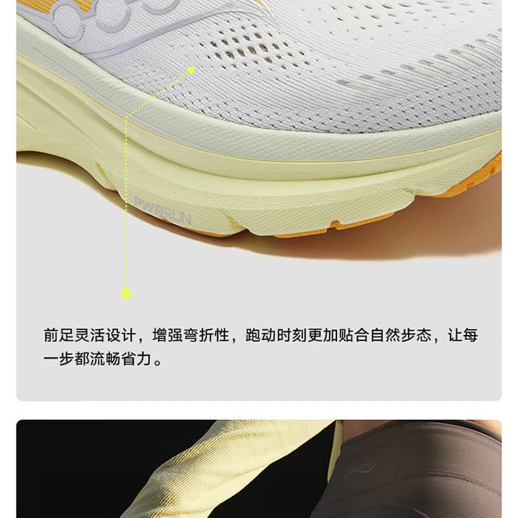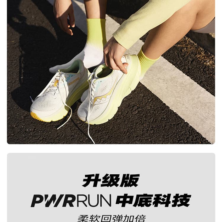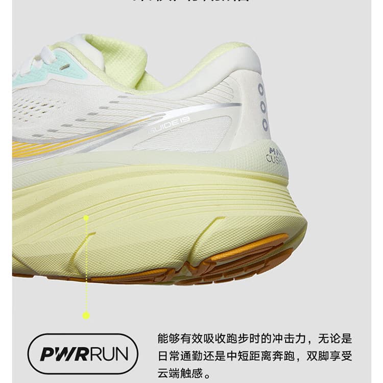 采用PWRRUN中底技术,提供柔软且富有回弹的脚感,缓震表现优异,能有效吸收冲击力,适合长距离慢跑和日常训练。相比前代,脚感更厚实饱满,提升了容错率和长距离保护性。