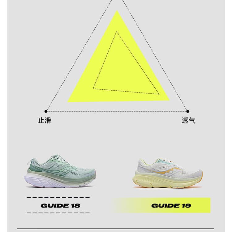 Saucony索康尼 GUIDE向导19是一款主打日常慢跑与稳定支撑的缓震跑鞋,适合追求舒适性与足部保护的跑者,尤其适用于轻度内旋、慢节奏训练和恢复跑场景。